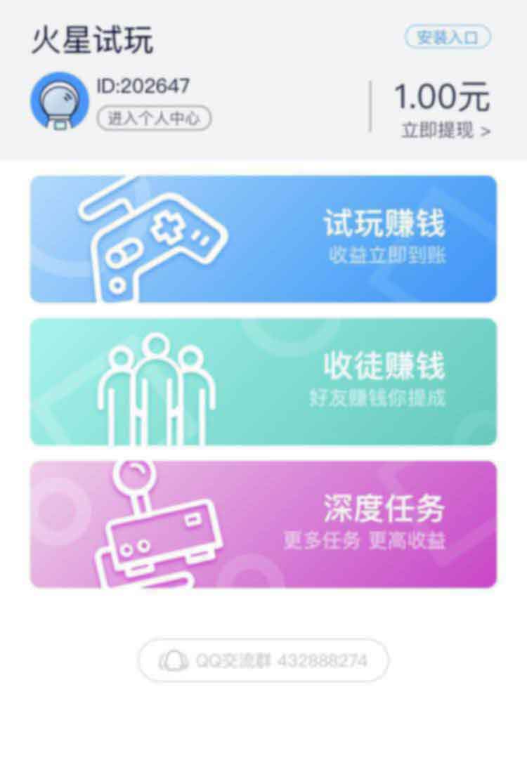 链接已下架 评分:8分 火星试玩 系 统: 苹果 分 类:试玩赚钱 大 小:8.8MB 厂 商:暂无资料 更 新:2019-06-09 备案号:暂无资料 下 载:341次 手机扫码访问 #火星试玩应用截图 #火星试玩应用介绍 火星试玩ios,是一款基于IOS的手机赚钱APP软件。试玩任务单价1元起,10元即可提现,邀请好友可享10%提成上不封顶。平台新上线任务多,每天抽出闲玩时间做做几个任务每个月多赚上千零花钱。 上一个 小白赚钱 下一个 OK赚 同类软件推荐 钱咖3.14MB 查看 多多红包3MB 查看 iMoney4.7MB 查看 小鱼赚钱8.2MB 查看 闪挣24.85MB 查看 小熊零花6.68MB 查看 应用试客2MB 查看 OK赚9MB 查看 评论列表 (0) 留言评论 提交评论