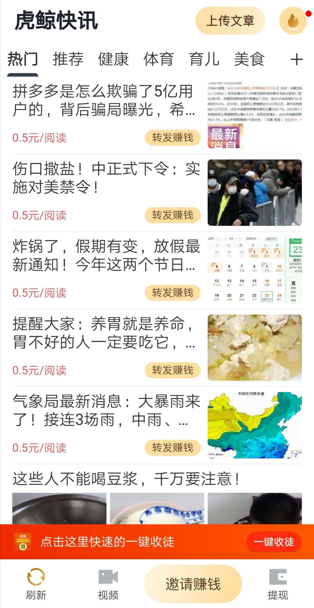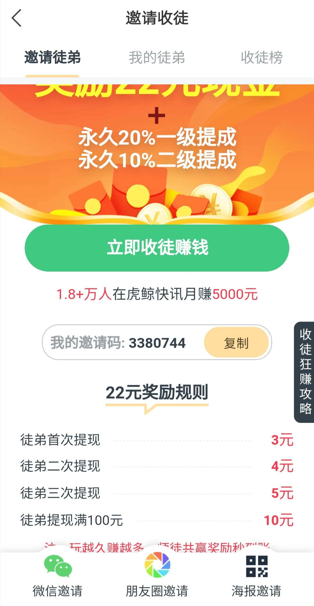 虎鲸快讯是章鱼快讯旗下的转发文章赚钱平台。下载虎鲸快讯app,每个人都可以用微信赚钱,通过坚持分享文章,达到月入千元的小目标。优质平台,推广期间单价高达0.7元,涨分很快,提现也特靠谱。赚取的零钱还可以通过微信提现,当日就能到账。快快来体验吧!
