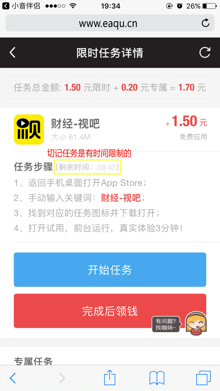 2、下载安装后打开钱咖钥匙,进入“限时任务”任务界面,点击单价高的任务先做(做任务期间,请保证钥匙“小音伴侣”在线,不要开启无痕浏览模式和Safari阻止cookie,所有任务都必须保证首次下载哦!)