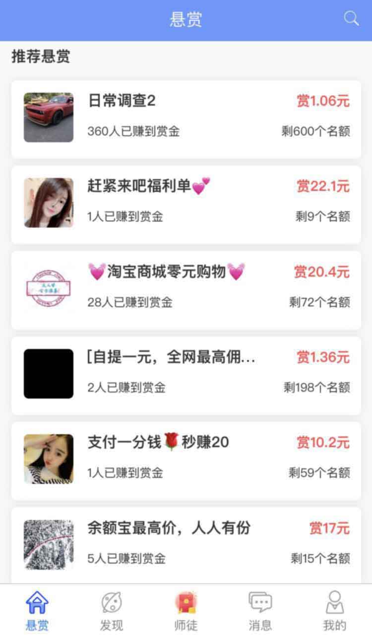 新注册的用户首先要从“简单悬赏”开始做起,完成新人任务就能提现一块多;新手刚刚注册的级别是Lv1,可以做0.5元以下的任务,只要完成几个小任务赚够1元以上立马升级为Lv2,可以做2元以下的任务,再做几个小任务赚够2元立马升级Lv3,可以做10元以下的任务,然后我们继续修炼直到你赚累计赚够50元,恭喜你达到平台最高级别,平台上所有的任务都可以做了。
